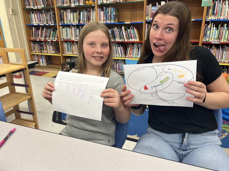To the left is a photo of tutor Campbell and student Charlotte B. The paper Charlotte's holding represents her neuron characters... don't they look so cool! Campbell is holding Charlotte's brain map. Our students draw different things in each of the lobes corresponding to the lobes' functions. This builds off our lesson from last week. It is such a wonderful experience for the tutors to teach their knowledge of neuroscience and see it through the imagination of their students.